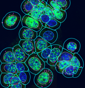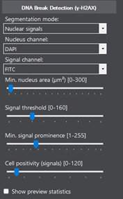 DNA Break Quant offers different segmentation modes, which allow us to examine signals, nuclear regions, and cytoplasmic circulating spots together.