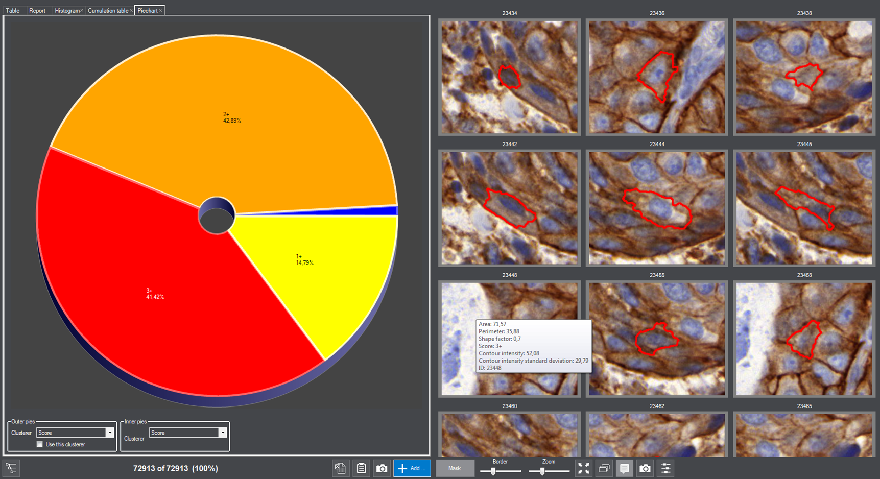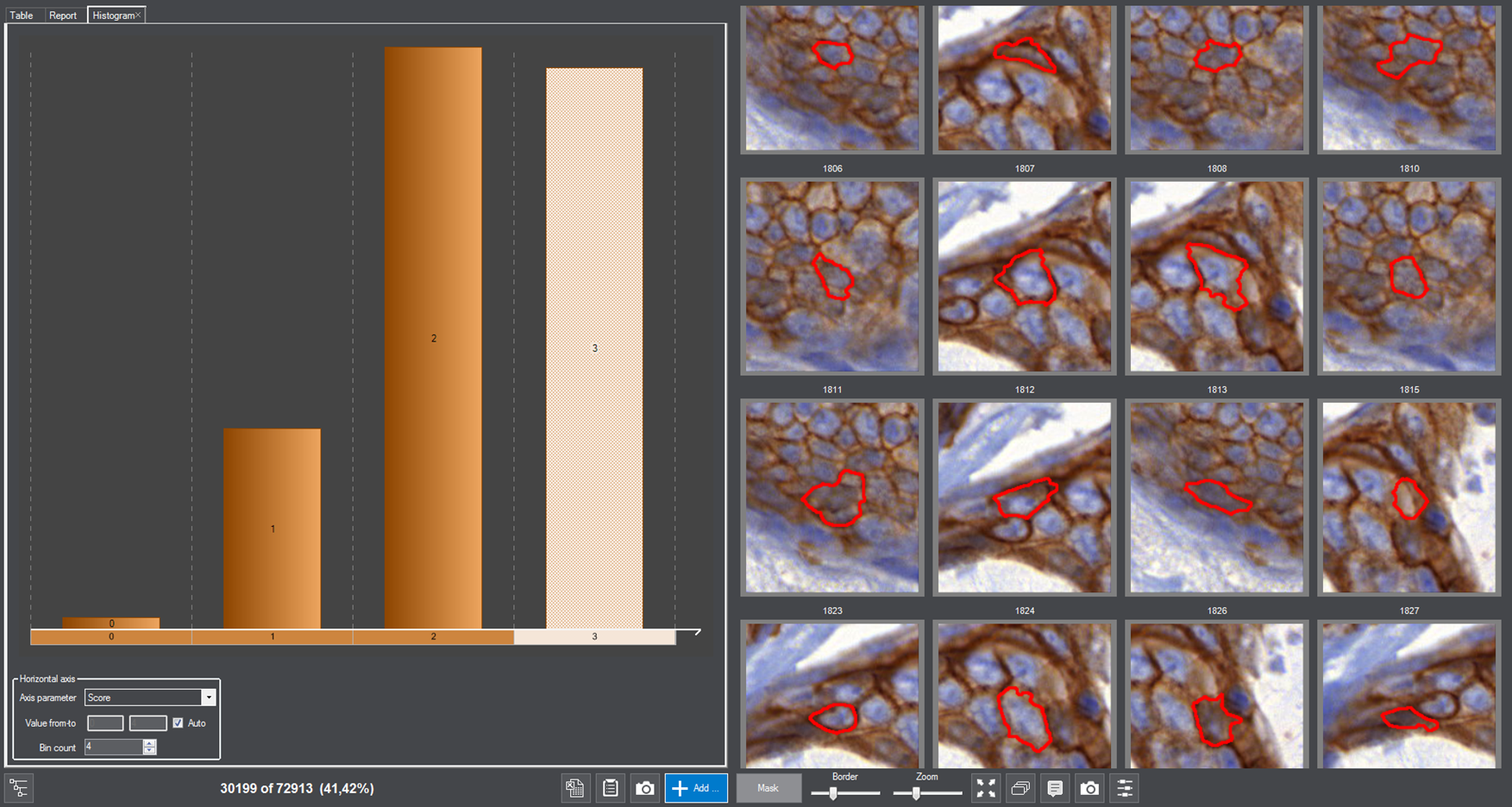 MembraneQuant is a cell membrane detection software application that can be used for the quantification of IHC stained histological samples. This module measures cell morphology and stain density, reports intensity-based core ranges, overall scores and positivity percentages (including H-Score), distinguishing the continuous membrane stain from the moderate stain.