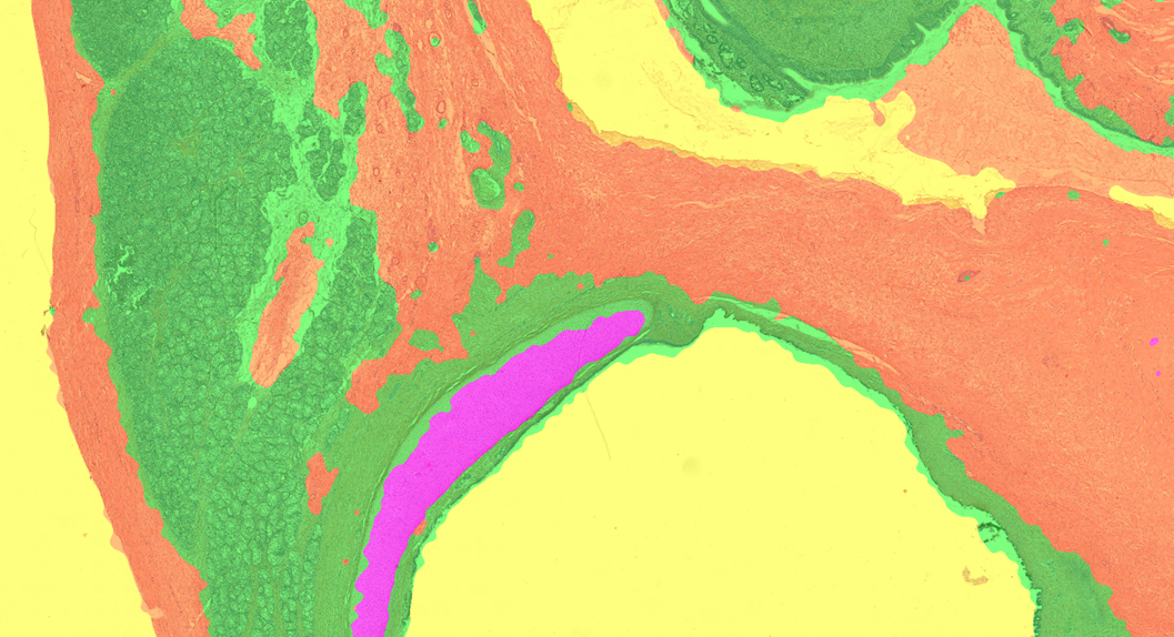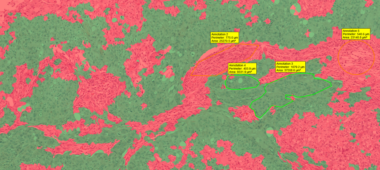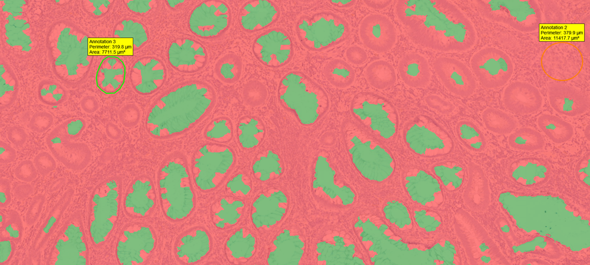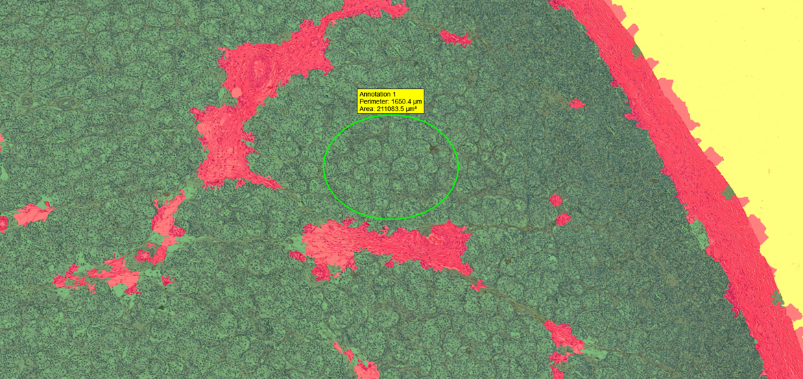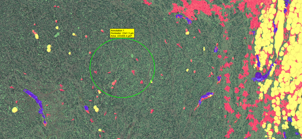 Color- and pattern-based image analysis solutions are used to identify different tissue elements in stained tissue. Instead of the time-consuming manual annotation, automated detection and annotation of a region of interest is available with a quick training on relevant tissue samples.